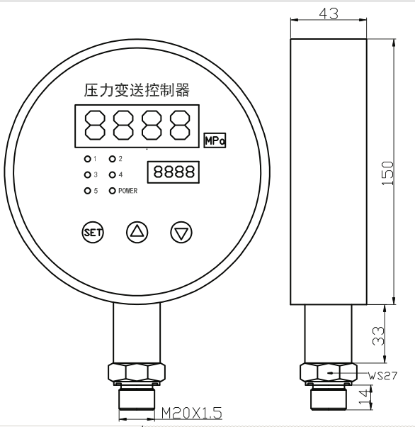PYK150智能壓力控制器是集壓力測量、顯示、輸出、五路控制于一體的智能數字壓力測控產品。不銹鋼接頭、擴散硅壓力芯體、全數字電路板組成,顯示直觀,操作簡單,安全可靠,開關點現場設置。廣泛應用于水電、自來水,石油、化工、機械、液壓等行業(yè),對流體介質的壓力進行測量和控制,并可遠傳輸出(4-20mA)及RS485組網。