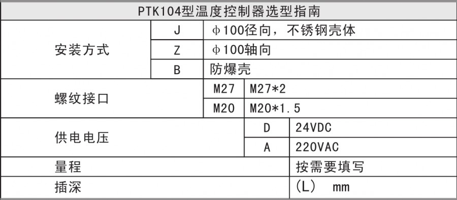 PTK104智能數(shù)字溫度控制器是集溫度測量、顯示、輸出、控制于一體的智能數(shù)字溫度測控產(chǎn)品。不銹鋼接頭、高精度PT100、全數(shù)字電路板組成,顯示直觀,操作簡單,安全可靠,開關(guān)點現(xiàn)場設(shè)置。廣泛應(yīng)用于水電、自來水,石油、化工、機械、液壓等行業(yè),對流體介質(zhì)的溫度進行測量和控制。